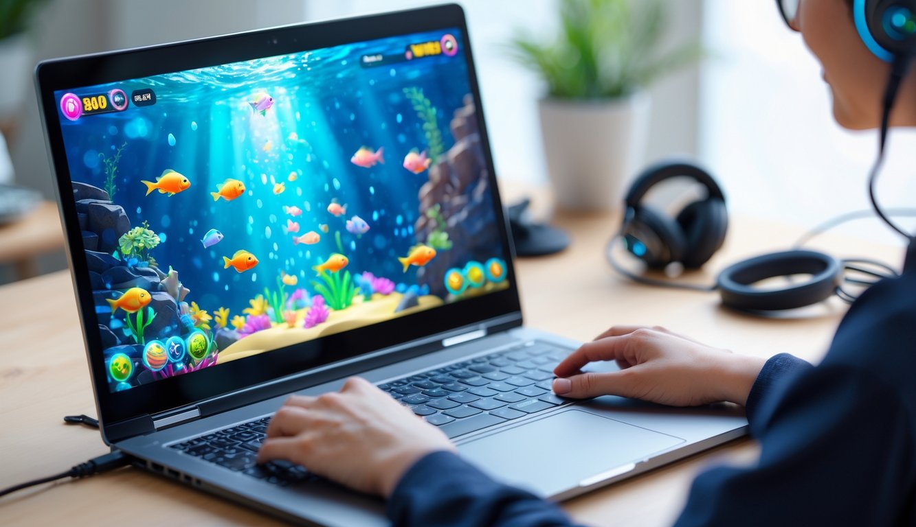 Seseorang sedang bermain permainan tembak ikan di komputer dengan latar belakang grafis bawah laut yang berwarna-warni.